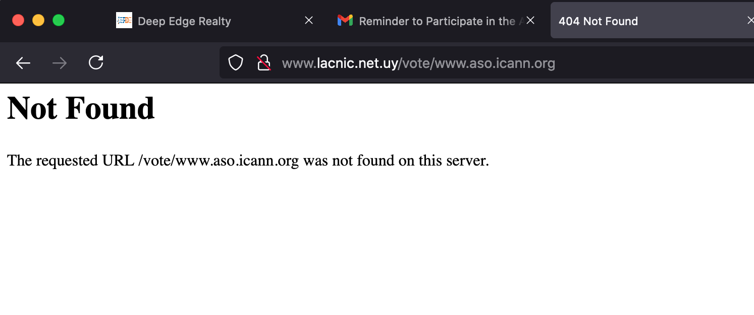Hi I think the 404 error is on me. It’s was supposed to be the landing page AFTER concluding the voting process (https://aso.icann.org) There are no problems in the tabulations or capture of your votes. But indeed it’s not optimal. I hope this bring clarification to the matter Apologies for the inconvenience. Regards German PS In a couple of hours the system will close to accept any more votes and I’ll be sending the results. From: Secretariat <secretariat-bounces@nro.net> on behalf of Martin Hannigan <hannigan@gmail.com> Date: Thursday, 15 July 2021 at 11:55 pm To: Jorge Villa <villa@reduniv.edu.cu> Cc: ASO Address Council Public Discussion List <ac-discuss@aso.icann.org> Subject: Re: [NRO secretariat] [AC-DISCUSS] Reminder ICANN NomCom ASO Representative Appointment Hi Jorge, and all! I am fine. I'm on vacation and getting some work done in between. I received the confirmation. However, we shouldn't have an election system that says both it succeeded and it failed. It would be great for the Secretariat to explain what broke, why and if there is any impact. Thanks! Martin On Thu, Jul 15, 2021 at 9:10 AM Jorge Villa <villa@reduniv.edu.cu<mailto:villa@reduniv.edu.cu>> wrote: Hi, how are you? I also received an error in the last step of the voting process and I worried too. But, a couple a minutes later, I received the correct confirmation message counting my vote with my correct preference. Definitively, the system is working fine. Regards, Jorge De: AC-DISCUSS [mailto:ac-discuss-bounces@aso.icann.org<mailto:ac-discuss-bounces@aso.icann.org>] En nombre de wafa Dahmani Enviado el: Thursday, July 15, 2021 2:28 AM Para: Kevin Blumberg <kevinb@thewire.ca<mailto:kevinb@thewire.ca>> CC: ASO Address Council Public Discussion List <ac-discuss@aso.icann.org<mailto:ac-discuss@aso.icann.org>> Asunto: Re: [AC-DISCUSS] Reminder ICANN NomCom ASO Representative Appointment Same for me Le jeu. 15 juil. 2021 à 04:25, Kevin Blumberg <kevinb@thewire.ca<mailto:kevinb@thewire.ca>> a écrit : Martin, I received the same error but got an email confirmation. Did you receive the confirmation? Kevin ________________________________ From: Martin Hannigan <hannigan@gmail.com<mailto:hannigan@gmail.com>> Sent: Wednesday, July 14, 2021 11:11 p.m. To: German Valdez Cc: ac-discuss@aso.icann.org<mailto:ac-discuss@aso.icann.org> Subject: Re: [AC-DISCUSS] Reminder ICANN NomCom ASO Representative Appointment Not positive if my vote was counted or there is a voting system problem. See attached error. Time of entry is approximately 7/15/2021 UTC 03:08 and within parameters. Thanks On Thu, Jul 8, 2021 at 4:46 AM German Valdez <german@apnic.net<mailto:german@apnic.net>> wrote: Dear ASO AC This is a reminder of the coming ASO appointment to the ICANN NomCom election You will receive an automated email around midnight Friday 9 July (UTC Time) with an unique token and url to cast your vote. This election is ruled by the ASO AC Procedures to Appoint Members to Various Bodies https://aso.icann.org/documents/operational-documents/procedures-to-appoint-members-to-various-bodies/<https://aus01.safelinks.protection.outlook.com/?url=https%3A%2F%2Faso.icann.org%2Fdocuments%2Foperational-documents%2Fprocedures-to-appoint-members-to-various-bodies%2F&data=04%7C01%7C%7C86dfa64e06b0477e476a08d947981654%7C127d8d0d7ccf473dab096e44ad752ded%7C0%7C0%7C637619541316233643%7CUnknown%7CTWFpbGZsb3d8eyJWIjoiMC4wLjAwMDAiLCJQIjoiV2luMzIiLCJBTiI6Ik1haWwiLCJXVCI6Mn0%3D%7C3000&sdata=lwTHwog6E6X630rz9ABp6IH8ViUHYetCojtfk%2FttgOY%3D&reserved=0> You will find a ballot with the candidates name (sorted by last name) and the abstention option. The appointment will be based on a relative majority if more than half of the AC members have voted. As soon as we reach the deadline ( 15 July 2021 23:59 UTC) or all ASO AC members have casted their votes, The Secretariat will report the results in this list by a relation of your assigned token and the selected candidate or abstention option. Kind regards German Valdez _______________________________________________ AC-DISCUSS mailing list - Workspace for ASO AC operations. Posting is restricted, archive is publicly available. AC-DISCUSS@aso.icann.org<mailto:AC-DISCUSS@aso.icann.org> https://aso.icann.org/mailman/listinfo/ac-discuss<https://aus01.safelinks.protection.outlook.com/?url=https%3A%2F%2Faso.icann.org%2Fmailman%2Flistinfo%2Fac-discuss&data=04%7C01%7C%7C86dfa64e06b0477e476a08d947981654%7C127d8d0d7ccf473dab096e44ad752ded%7C0%7C0%7C637619541316243598%7CUnknown%7CTWFpbGZsb3d8eyJWIjoiMC4wLjAwMDAiLCJQIjoiV2luMzIiLCJBTiI6Ik1haWwiLCJXVCI6Mn0%3D%7C3000&sdata=FzIdu%2Bv3Mz1N5iL0jYfke3BoDb3oUzGmdC%2FlRdykVRw%3D&reserved=0> _______________________________________________ AC-DISCUSS mailing list - Workspace for ASO AC operations. Posting is restricted, archive is publicly available. AC-DISCUSS@aso.icann.org<mailto:AC-DISCUSS@aso.icann.org> https://aso.icann.org/mailman/listinfo/ac-discuss<https://aus01.safelinks.protection.outlook.com/?url=https%3A%2F%2Faso.icann.org%2Fmailman%2Flistinfo%2Fac-discuss&data=04%7C01%7C%7C86dfa64e06b0477e476a08d947981654%7C127d8d0d7ccf473dab096e44ad752ded%7C0%7C0%7C637619541316243598%7CUnknown%7CTWFpbGZsb3d8eyJWIjoiMC4wLjAwMDAiLCJQIjoiV2luMzIiLCJBTiI6Ik1haWwiLCJXVCI6Mn0%3D%7C3000&sdata=FzIdu%2Bv3Mz1N5iL0jYfke3BoDb3oUzGmdC%2FlRdykVRw%3D&reserved=0> _______________________________________________ AC-DISCUSS mailing list - Workspace for ASO AC operations. Posting is restricted, archive is publicly available. AC-DISCUSS@aso.icann.org<mailto:AC-DISCUSS@aso.icann.org> https://aso.icann.org/mailman/listinfo/ac-discuss<https://aus01.safelinks.protection.outlook.com/?url=https%3A%2F%2Faso.icann.org%2Fmailman%2Flistinfo%2Fac-discuss&data=04%7C01%7C%7C86dfa64e06b0477e476a08d947981654%7C127d8d0d7ccf473dab096e44ad752ded%7C0%7C0%7C637619541316253554%7CUnknown%7CTWFpbGZsb3d8eyJWIjoiMC4wLjAwMDAiLCJQIjoiV2luMzIiLCJBTiI6Ik1haWwiLCJXVCI6Mn0%3D%7C3000&sdata=lGxM06H7igZnIsF1rtfe5L%2FOxuPGUaQ1NQ7MNT9%2FYVI%3D&rese